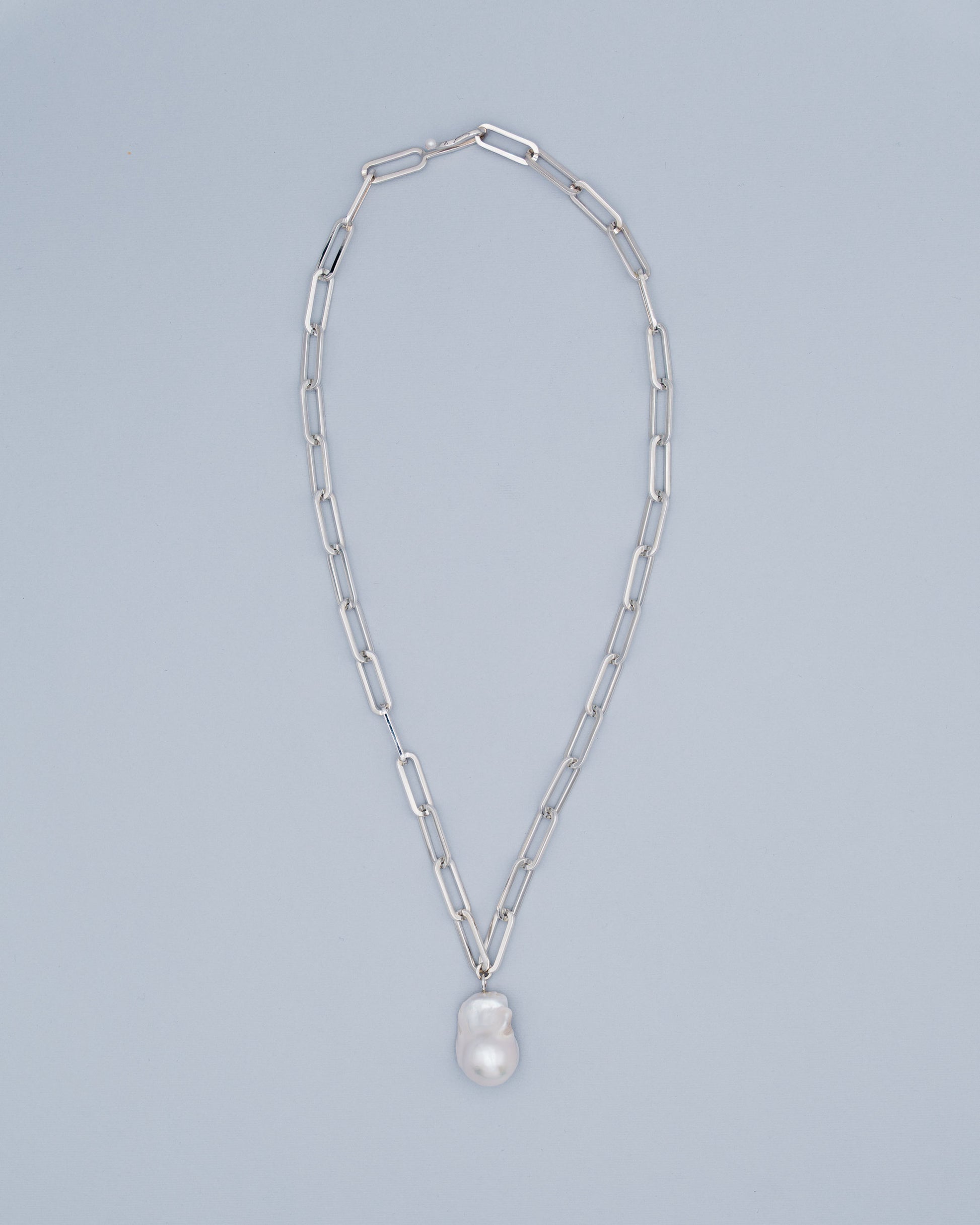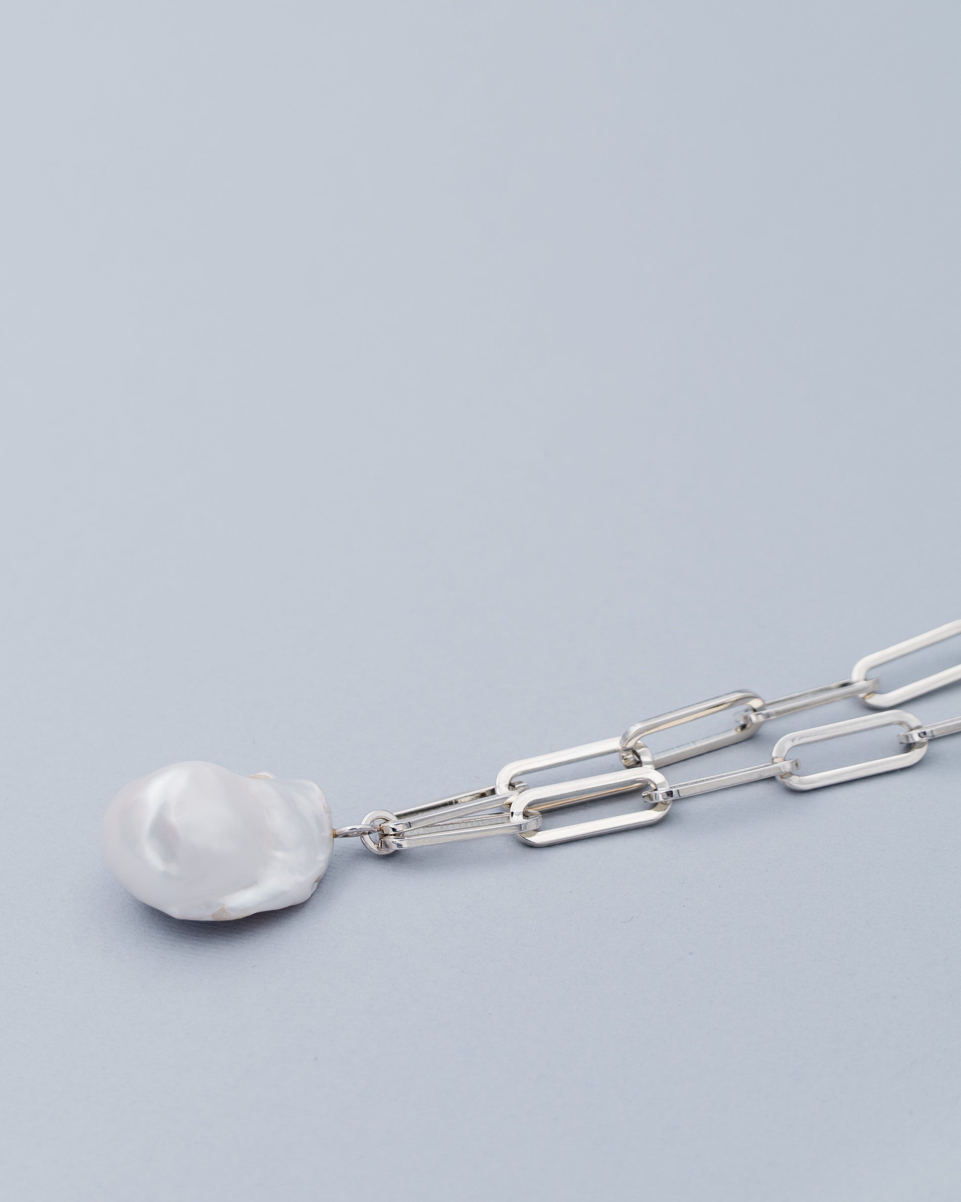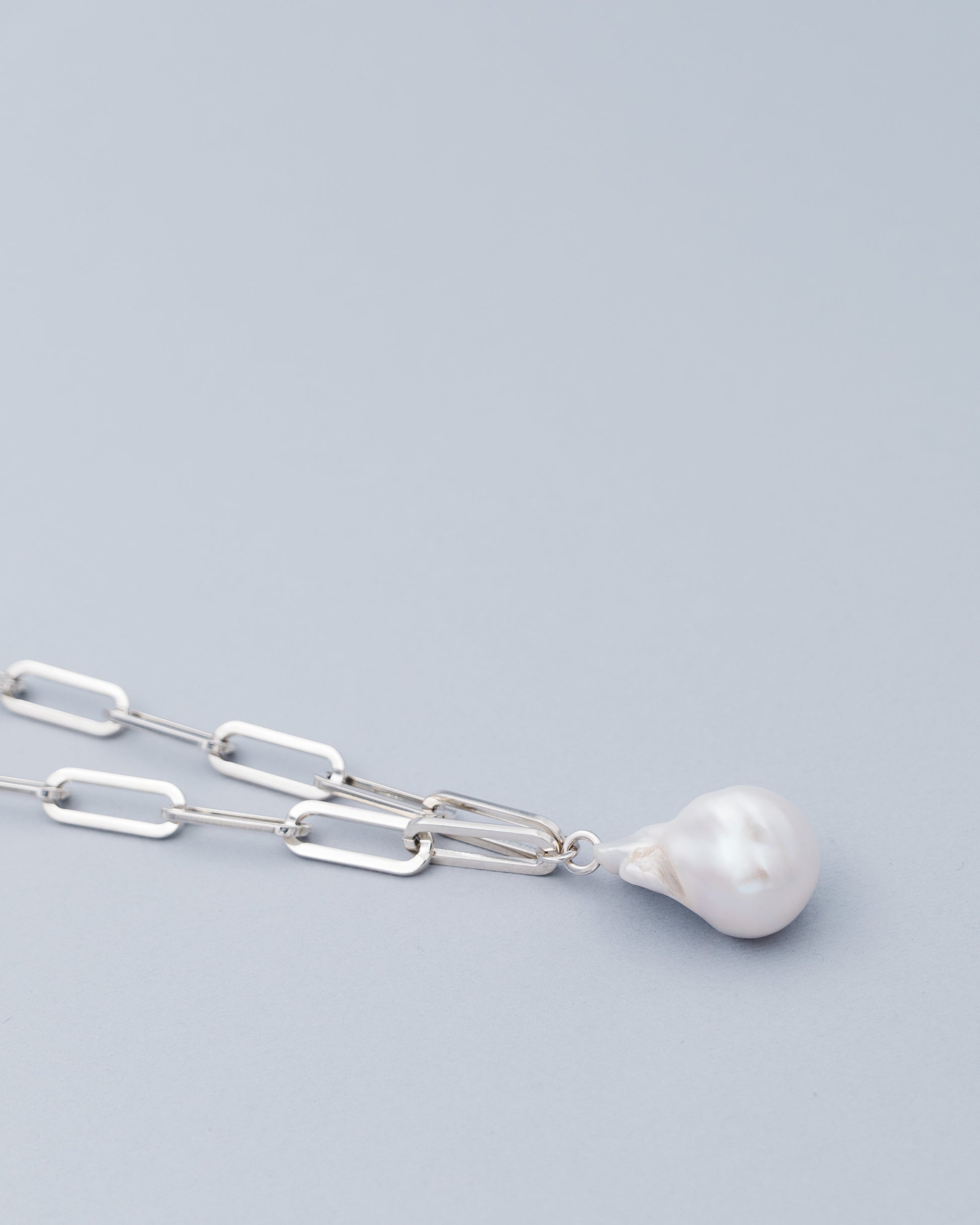 The Mi Aura Necklace features a single baroque pearl pendant paired with a bold, chunky chain. Its clean, minimalist style is designed for everyday wear, blending understated elegance with a subtle edge.